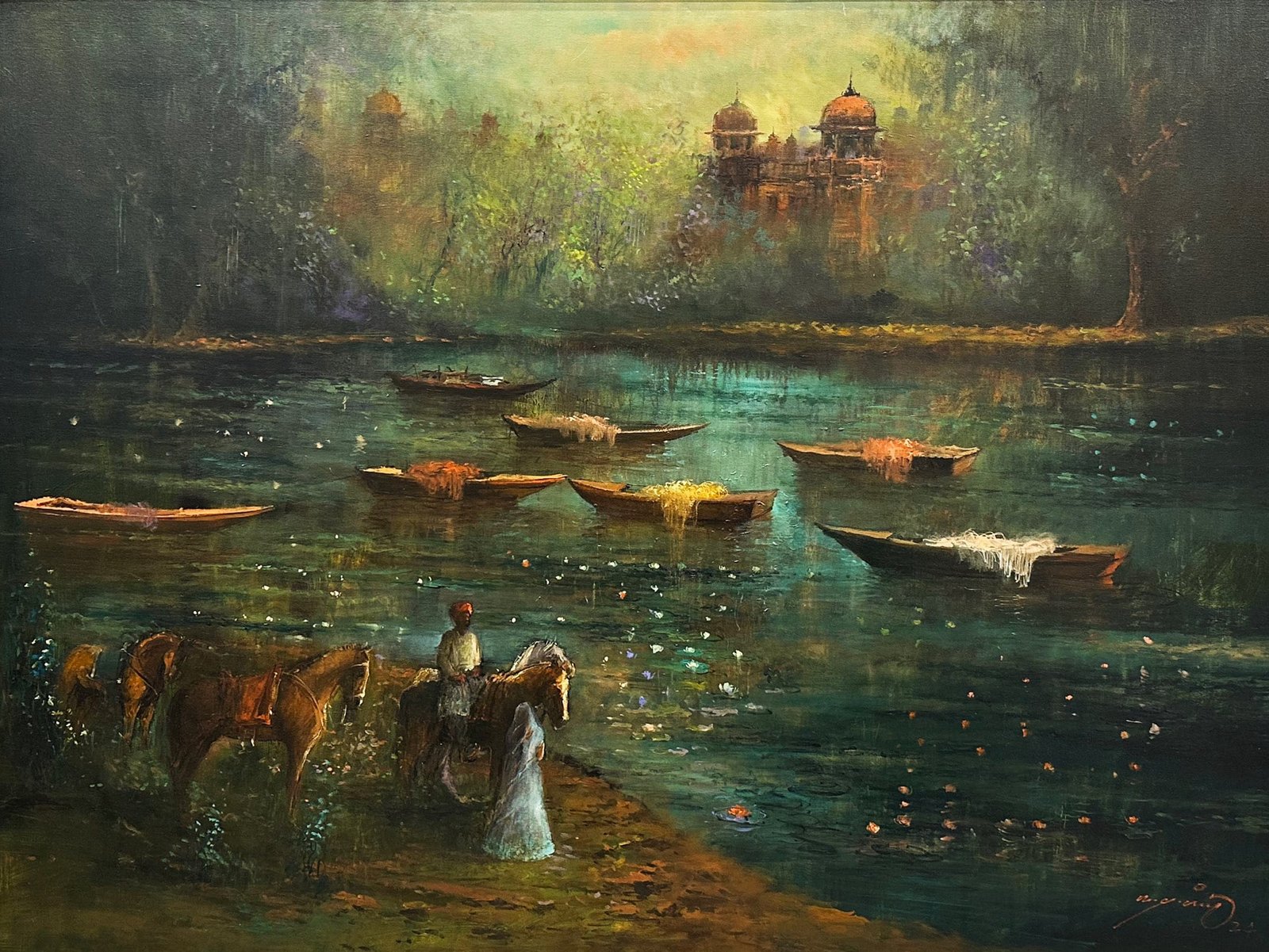 A. Q. Arif captures the mystique of timeworn domes hidden amidst lush greenery under a mystical green sky. The interplay of warm and cool tones evokes a sense of nostalgia, as the silent grandeur of the architecture stands resilient against nature’s embrace. The painting transports the viewer to a realm where history and spirituality intertwine, offering a moment of reflection and serenity.