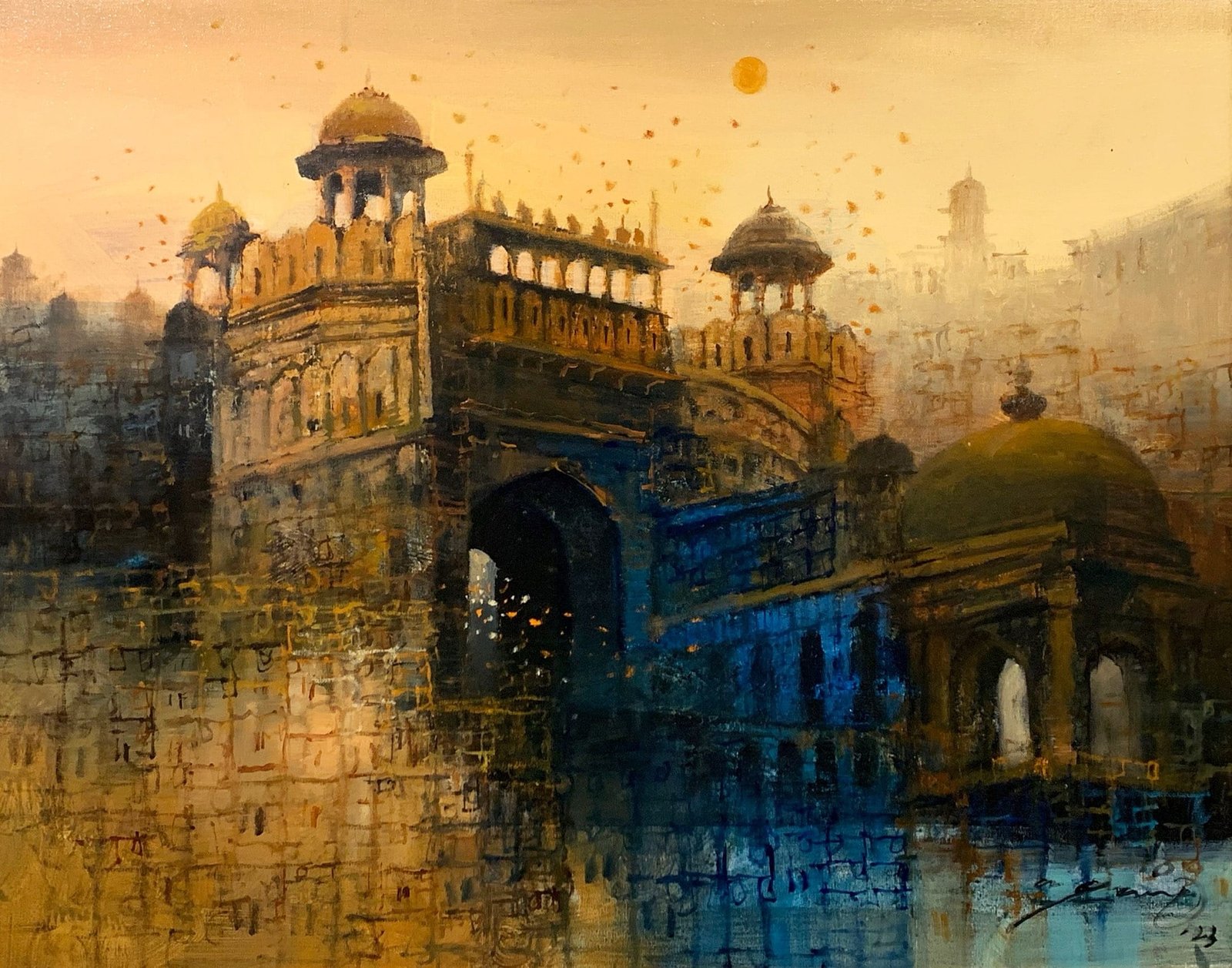 A. Q. Arif captures the mystique of timeworn domes hidden amidst lush greenery under a mystical green sky. The interplay of warm and cool tones evokes a sense of nostalgia, as the silent grandeur of the architecture stands resilient against nature’s embrace. The painting transports the viewer to a realm where history and spirituality intertwine, offering a moment of reflection and serenity.