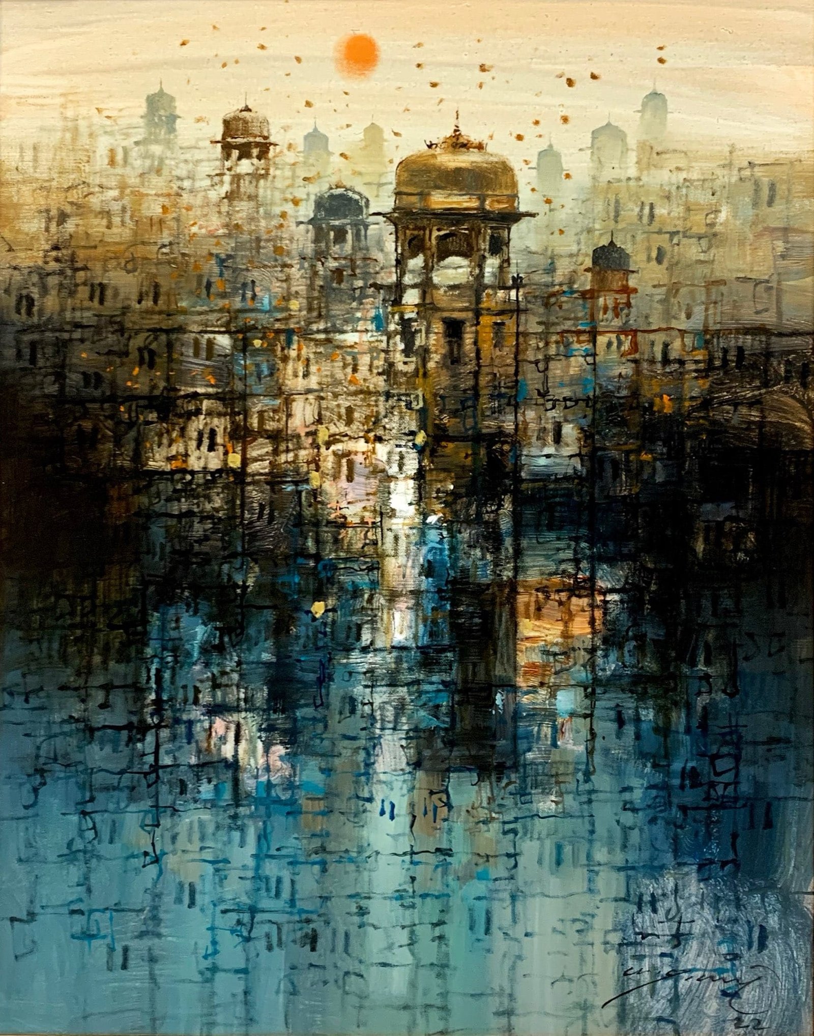 A. Q. Arif captures the mystique of timeworn domes hidden amidst lush greenery under a mystical green sky. The interplay of warm and cool tones evokes a sense of nostalgia, as the silent grandeur of the architecture stands resilient against nature’s embrace. The painting transports the viewer to a realm where history and spirituality intertwine, offering a moment of reflection and serenity.