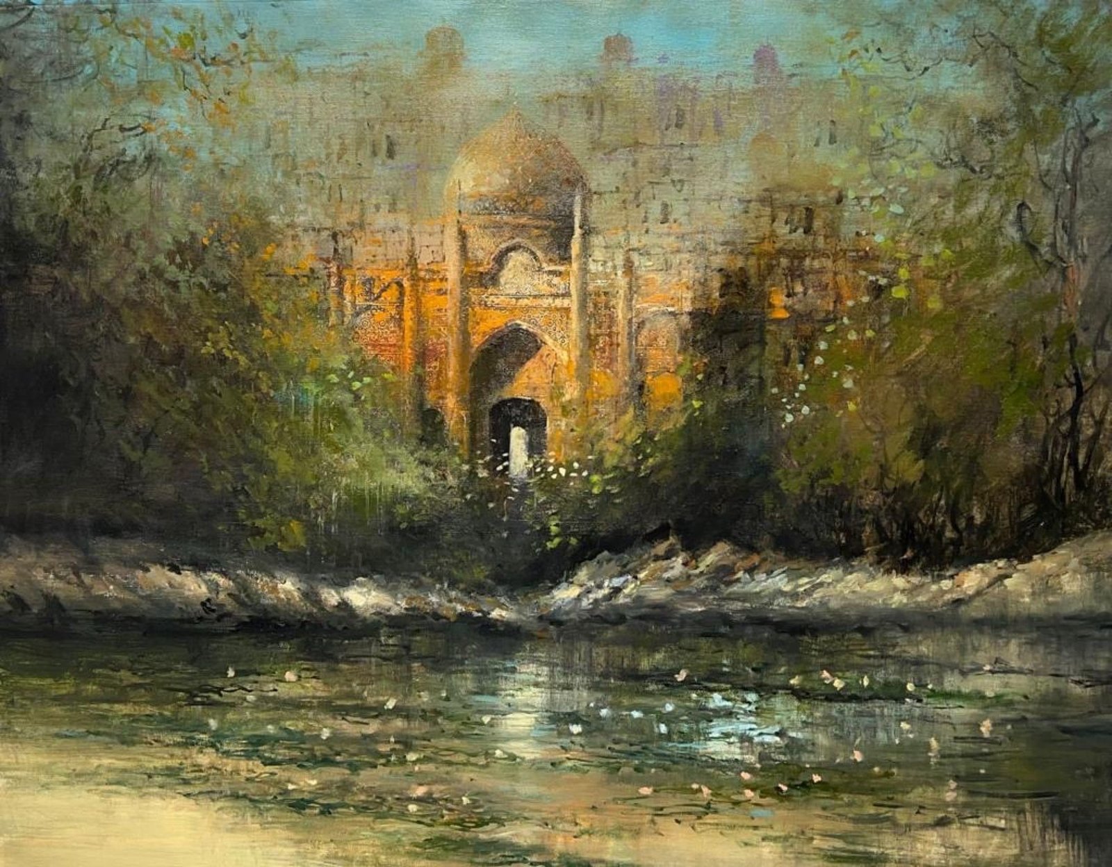 A. Q. Arif captures the essence of a forgotten past through this mesmerizing depiction of historic architecture veiled in mist and mystery. The soft golden glow of the ancient structure contrasts beautifully with the lush greens and the serene waters in the foreground, evoking a sense of nostalgia and tranquility. This painting invites the viewer to step into a dreamlike journey through time, where nature and heritage harmoniously coexist.