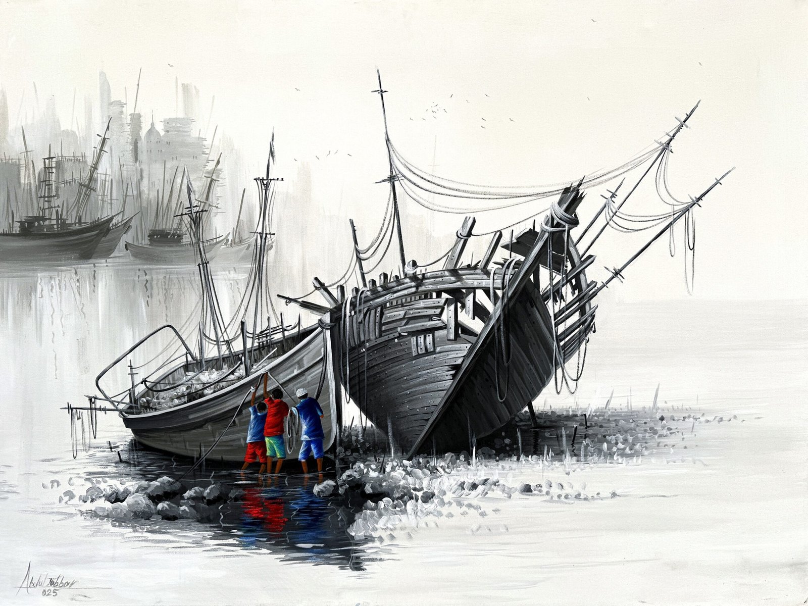 In Silent Shores, Abdul Jabbar captures the essence of maritime nostalgia with a striking monochrome palette, contrasted by the vivid clothing of fishermen at work. The abandoned boats, weathered by time, tell a story of resilience and the ever-changing tides of life. The misty harbor in the background adds depth, evoking a sense of mystery and longing.