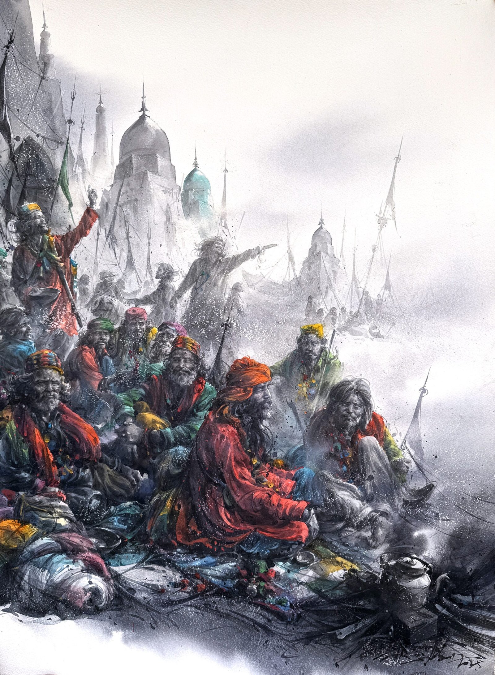 Sufi Soul Gathering by Ali Abbas is a mesmerizing watercolour composition capturing a spiritual congregation of Sufis enveloped in mystic ambiance. With flowing robes, expressive faces, and domes emerging from the misty background, the piece pays homage to devotion, brotherhood, and the eternal connection between man and the divine.