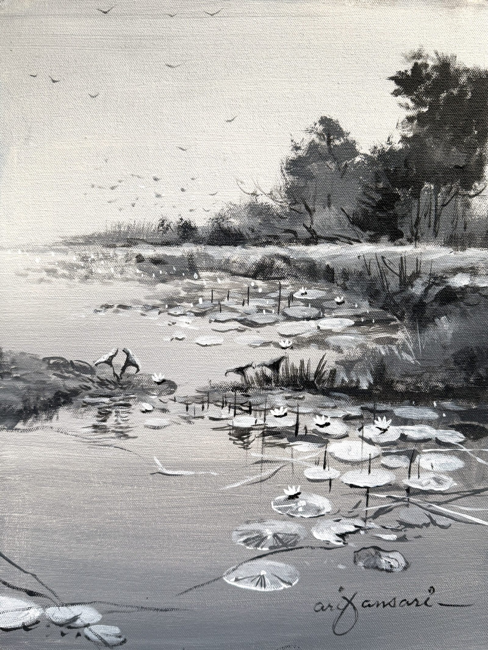 A tranquil monochrome landscape by Arif Ansari, capturing the stillness of water lilies resting on a calm wetland. Soft tonal transitions and delicate brushwork evoke peace, reflection, and harmony with nature.