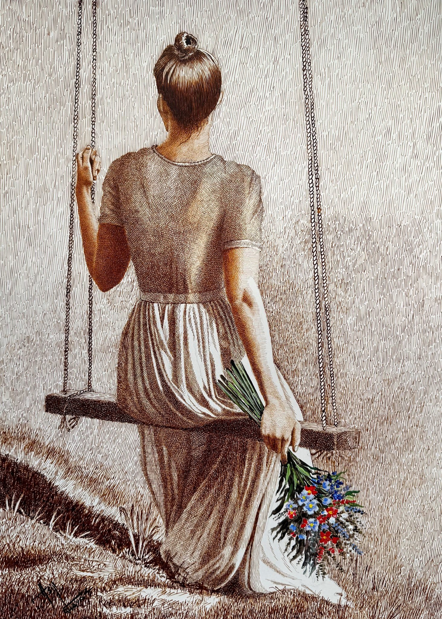 Description: Asif Ghayaz intricately weaves tradition and elegance in this mesmerizing pen and ink artwork. The delicate details and refined textures bring the subject to life, evoking a sense of nostalgia and cultural richness. Each stroke tells a story of grace, beauty, and timeless artistry.