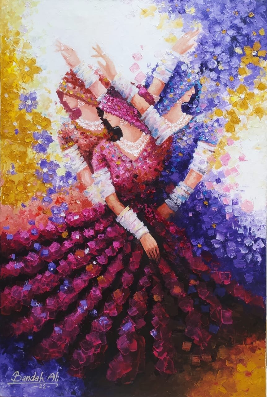 #BandahAli #RhythmInBloom #DancingWomen #PakistaniArt #OilOnCanvas #FigurativeArt #ImpressionistDance #ColorfulPainting #CulturalArt #SouthAsianArt #ContemporaryFigurativeArt #ArtOfMovement
