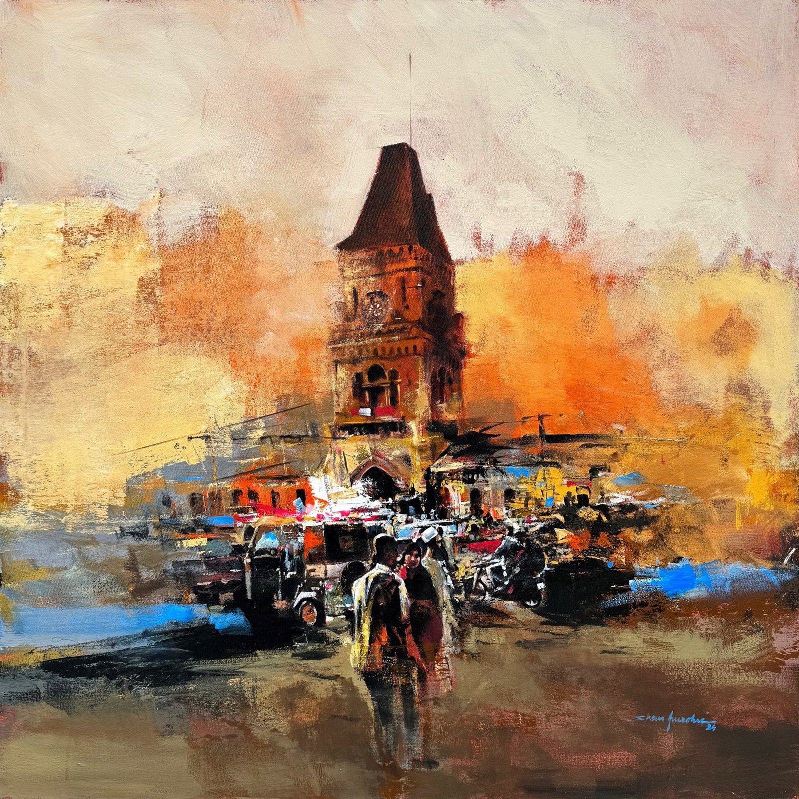 Shan Amrohvi masterfully portrays the iconic Empress Market, one of Karachi’s most cherished historical landmarks. This vibrant painting captures the architectural splendor and cultural significance of the colonial-era structure, blending warm and cool tones to reflect its timeless essence. The detailed brushwork and dynamic composition bring the city’s rich heritage to life, making it a striking piece for collectors and history enthusiasts alike.