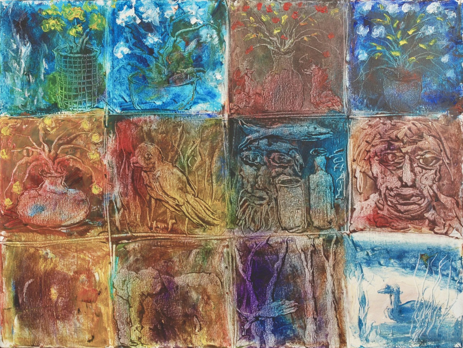 This 18×24 inch oil on canvas by Tassaduq Sohail unfolds as a grid of evocative vignettes—faces, vessels, birds, and organic forms—each rendered with layered textures and expressive color. The composition feels like a visual diary, where memory, identity, and time intersect. Earthy tones meet vibrant blues and reds, creating a rhythmic balance between abstraction and narrative, inviting the viewer to pause and interpret each fragment as part of a larger human story.