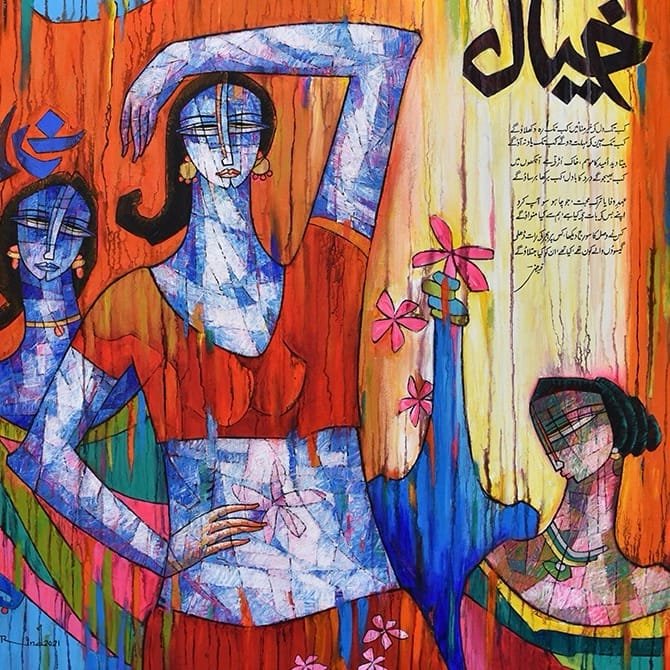 A.S. Rind’s Khayaal is a mesmerizing portrayal of feminine grace, strength, and introspection. The composition features elegantly adorned women, their expressions exuding confidence and mystery. The use of intricate patterns, flowing garments, and bold calligraphy adds a poetic essence to the painting, symbolizing deep emotions and cultural heritage. The vibrant hues and dripping textures enhance the dreamlike quality of the artwork, making it a captivating centerpiece.
