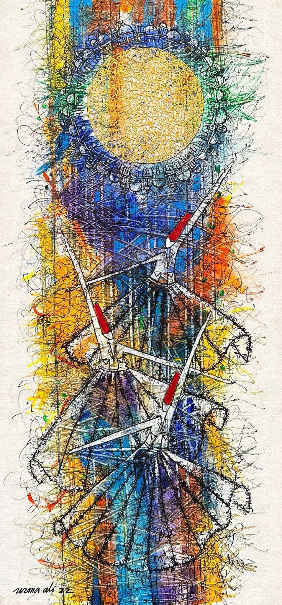Whirling in Light by Uzma Rashid is a vivid expression of spiritual ecstasy. With luminous calligraphy radiating from the golden core, the dervishes dance in harmony with vibrant energy fields of color—symbolizing transcendence, unity, and divine connection.